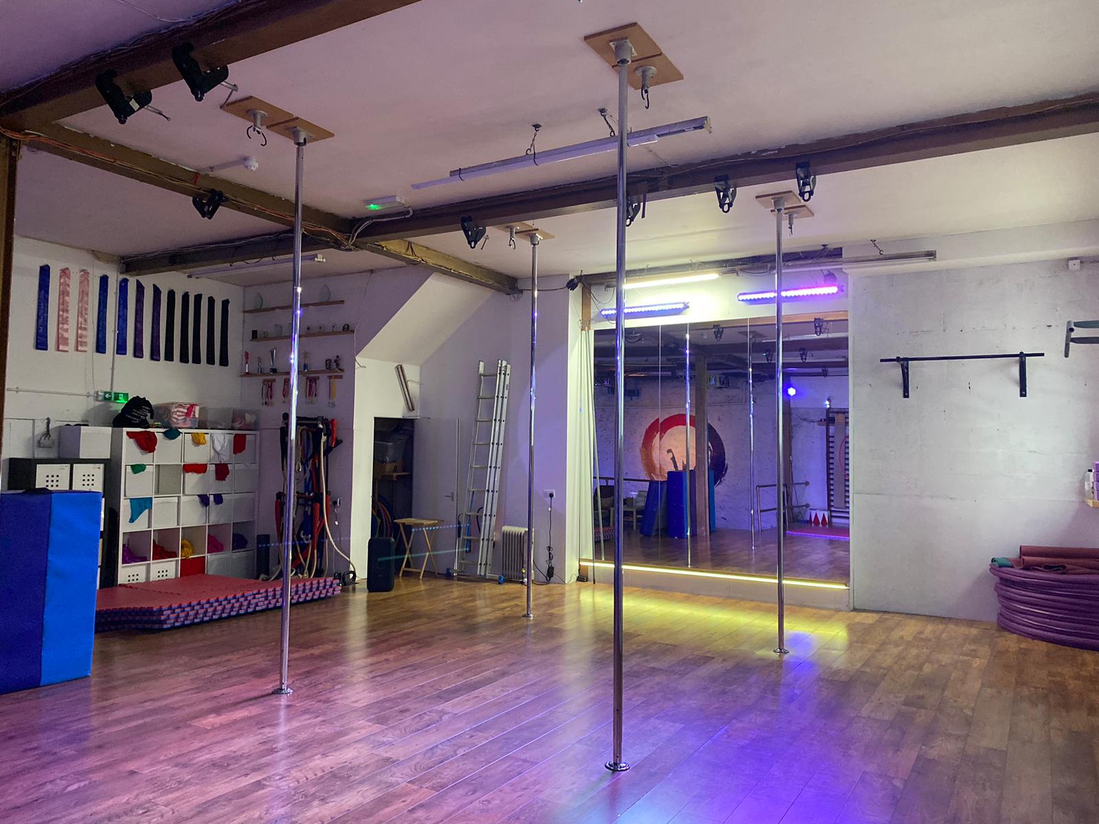 We’re in a former warehouse with two floors. Downstairs we have our first Pole Studio (with competition poles), a large Aerial floor (with 2.5m height), an Aerial Pit (with 3.5m height). Upstairs is our second Pole Studio, our gender-neutral bathrooms, lockers and changing rooms, and a kitchen for open use.
